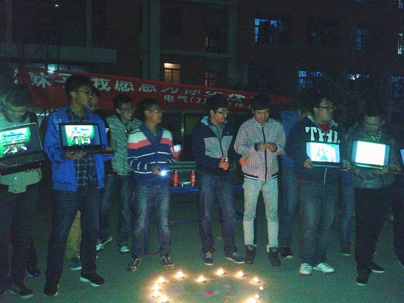 3月7日晚9点,电气1303全体男生在14号女生宿舍楼下表演节目,在思美节夜晚为女生献上真挚的祝福。