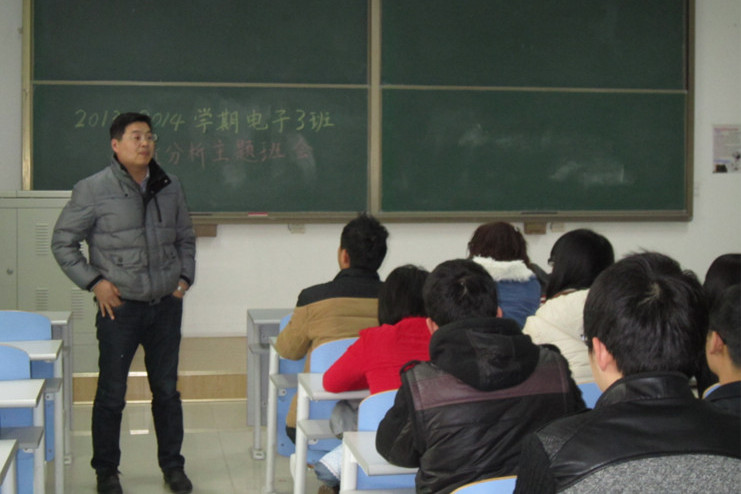 2014年3月1日,12级电子三班全体同学在南教216教室举行了以“2013-2014学年成绩分析”为主题的班会活动,并邀请班主任宋华军老师参与本次班会。会上班长、团支书、学习委员以及班主任老师针对上年度成绩作了细致分析并对本学期的学习做了统筹计划。