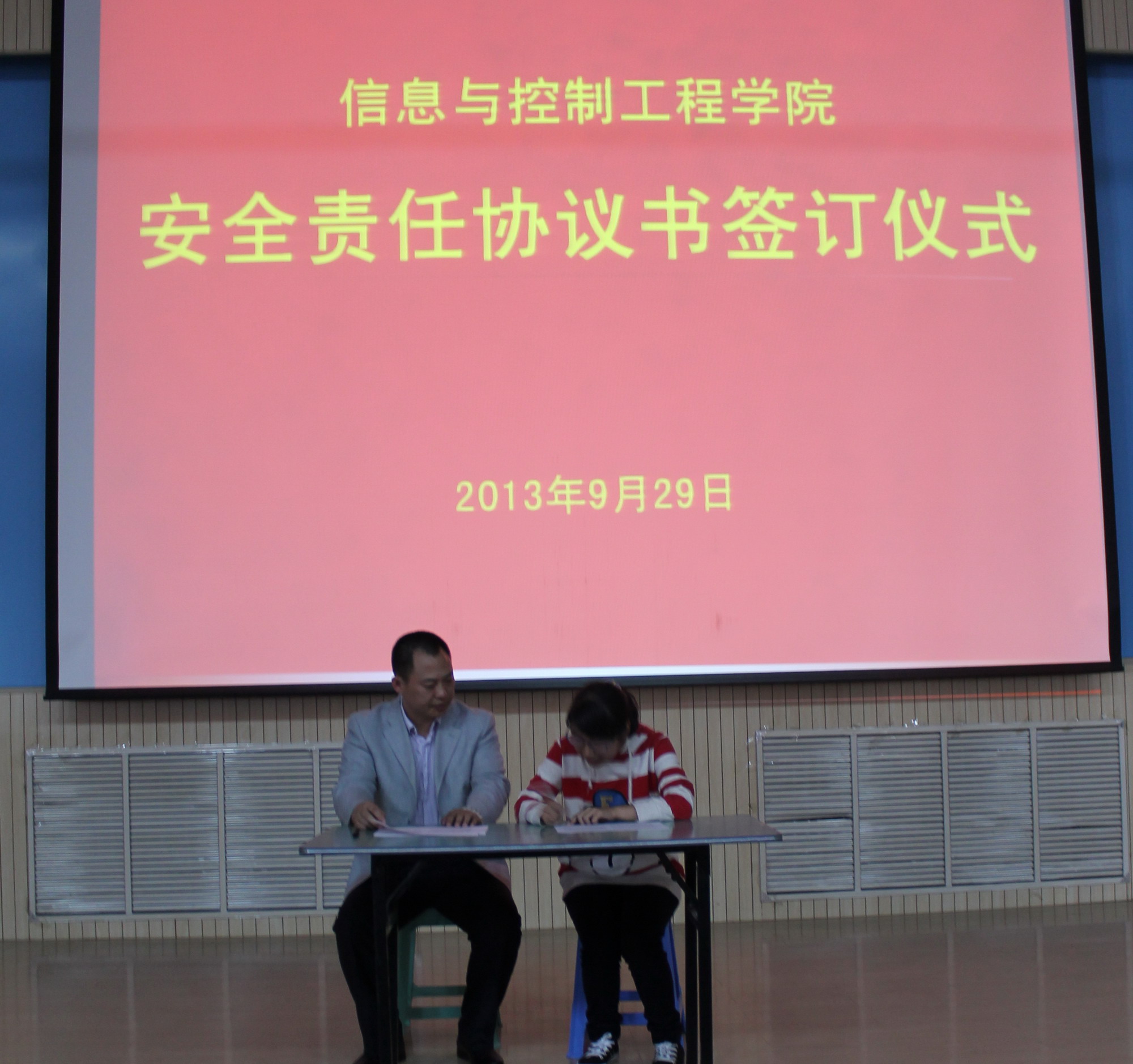 9月29日,2013级新生于南教100参加了安全责任协议书签订仪式,出席仪式的有公司党委副书记付罡老师、院团委书记赵小明老师及新生辅导员孟兆刚老师、王彦丽老师。