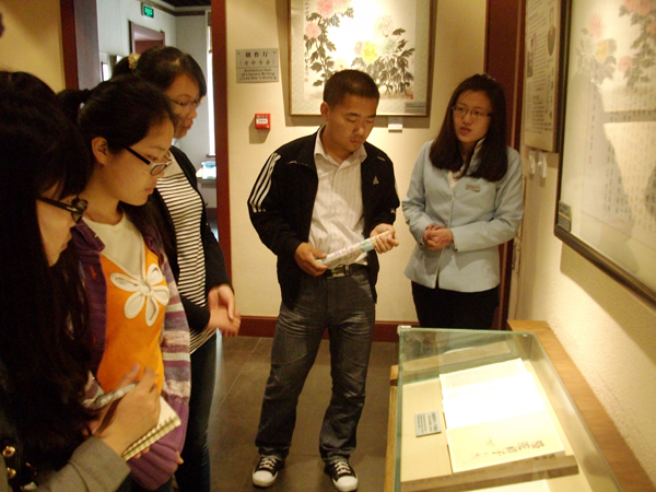 在馆内志愿者的指引讲解下,同学们参观了版本厅、创作厅、文艺厅三个展厅,讲述了老舍先生创作《骆驼祥子》的过程。参观过程中,我们有幸观摩了珍贵的《骆驼祥子》手稿。这一珍贵的材料让我们体会到老舍先生搜索素材及创作的艰辛,同学们无一不被老舍先生的那种求真务实的治学态度深深地感动。