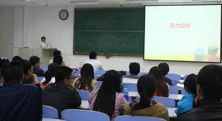 毕静老师首先公布了2011年在信控与储建学院研究生中的部分调研结果,并通过三方面展开了话题:压力来自身体疾病和认知、情绪、行为等的改变;当自身陷入负面情绪时,如何通过认识、行为和生理等不同方式来正确应对;对存在自杀意念的朋友进行援助时要给予关爱,及时告知老师并协助其求助专业辅导。最后毕静老师希望研究生们能消除对心理咨询的偏见,在需要的时候积极寻求心理方面的帮助,努力做到“爱自己、会自助、助他人”。