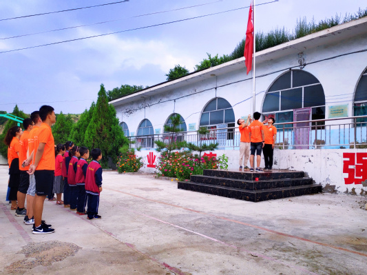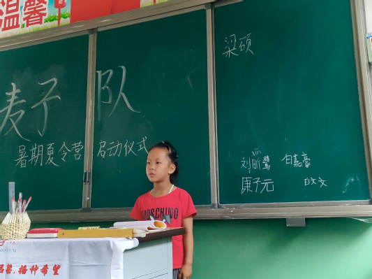 适逢八一建军节,在学校操场上,伴随着《义勇军进行曲》,庄严的升旗仪式拉开了此次开学典礼的序幕,也标志着麦子队为期两周的暑期支教活动的正式开始。开学典礼结束,回到教室后,麦子支教队队长梁硕首先做了简短的自我介绍并表达自己对固贤乡寄宿制小学所有员工的殷切期望,在其带领下,员工们依次走上讲台做自我介绍,其中,员工刘昕鹭在介绍自己名字的时候还在黑板上标注了拼音,便于大家拼读,此举收获了台下热烈的掌声。随后,队员们也走上讲台进行自我介绍,队员肖振说道:“我的名字叫肖振,振代表振作,也许我们都会遇到挫折失意,但是我们都应当怀揣对生活的希望振作起来,实现自己的梦想!”。启动仪式现场气氛热烈,台下掌声不息。