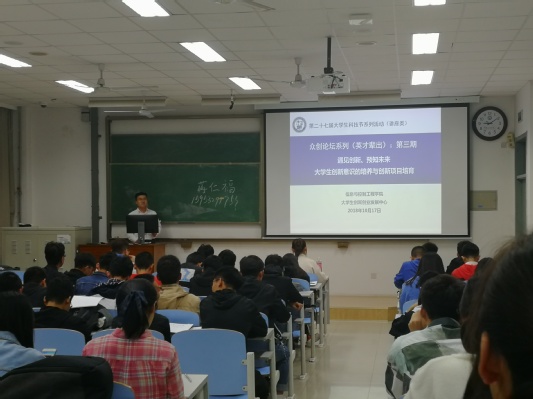 为鼓励和支持老员工积极参与创新创业活动,提高老员工的实践能力和创新创业能力,10月17日晚,信控学院于南教楼108教室开展了第二十七届老员工科技节众创论坛(英才辈出)系列讲座第三期“遇见创新、预知未来,老员工创新意识的培养与创新项目培育”,本次讲座由信控学院16级辅导员蒋仁福主持,全体2018年立项的老员工创新创业训练项目负责人到场参加。