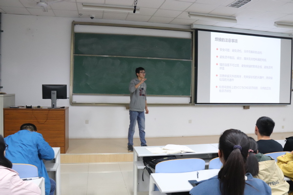 首先,张志涛通过图片加文字的形式为同学们介绍了焊接基本工具,展示了风枪焊台和洞洞板的实物,并详细地讲解了每种工具的使用方法与注意事项。随后,他就“设计电路原理图”、“设计洞洞板图”、“走线,修改走线”的三个步骤讲解了如何设计电路。在讲到焊接的经验时,他用“善于设置跳线”的方法在黑板上作图举例,同时他也强调到,这种方法虽然简单,但容易出错,并建议同学们少用。讲座最后,他从焊接不同类型元件的角度讲解了具体焊接方法,并为同学们播放了电路焊接基础视频。培训结束后,张志强又为多名同学进行答疑。