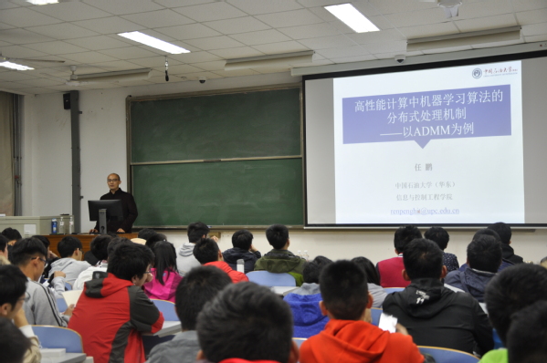 此次讲座的主题是“人工智能是什么,人工智能学科的发展现状与未来趋势,人工智能与各专业学科的关系。”在讲座的开始,任鹏教授先提醒在场听众在听讲的过程中关注几个名词:“高性能计算”、“分布式处理”、“ADMM”。然后,他又提出“为什么要高性能计算?”、“怎么能算得更快?”、“高性能计算的本质?”三个问题来引出主要内容。而后,又从现实角度出发,提出GPU这一概念,用两个传统c语言的实例为听众们着重区分了CPU与GPU的不同特点。其中,任鹏教授还特别在黑板上写下一个新单词“Wintel”,并围绕此单词进行拓展。最后,他总结了三种并行处理方式的特点,以孙凝辉的一句话:“计算机体系结构的最大挑战为处理负载的不确定性。跨越“端网云”的端到端的延迟可控则是对计算机系统最大的挑战性难题。”作结。