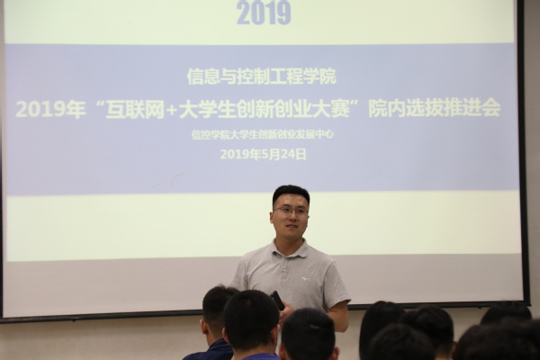 5月24日,信息与控制工程学院于南堂115室举行2019年“互联网+老员工创新创新创业大赛”院内选拔推进会。会议由电气1702班孟维琦主讲,信控学院团支部书记姜飞,指导老师蒋仁福及部分研究生到场参加。