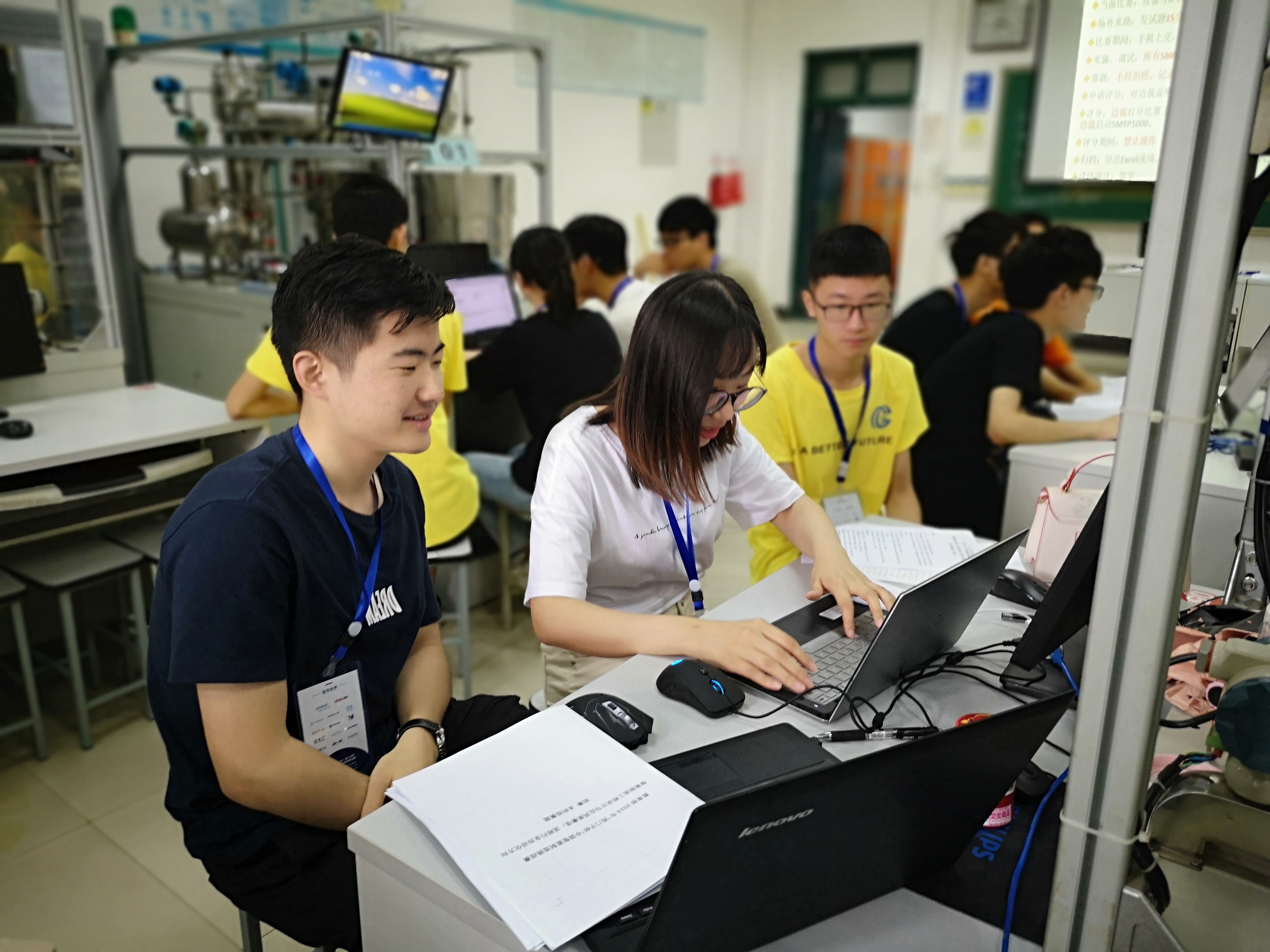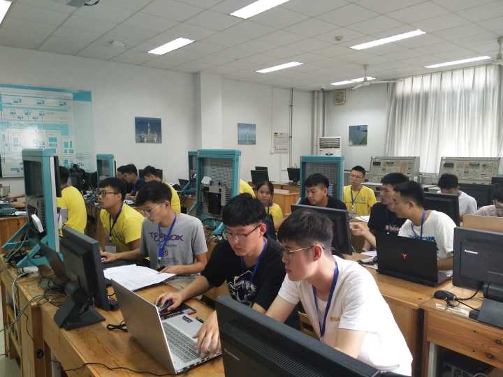 早晨8点比赛正式开始,在基础B315教室进行的是流程行业自动化方向比赛,在基础B219教室进行的是离散行业自动化方向比赛。开赛前15分钟,各支参赛队伍的选手到达检录室,开始依次进行检录,在志愿者引导下列队前往赛场到达指定机位。主裁判宣读比赛规则后,分发赛题。参赛选手则需要按照试题要求在设备上调试、运行自己开发的程序。随着比赛计时开始,各支参赛队伍的队员一边在计算机上运算数据,一边调试设备。赛场秩序井然,气氛紧张激烈。