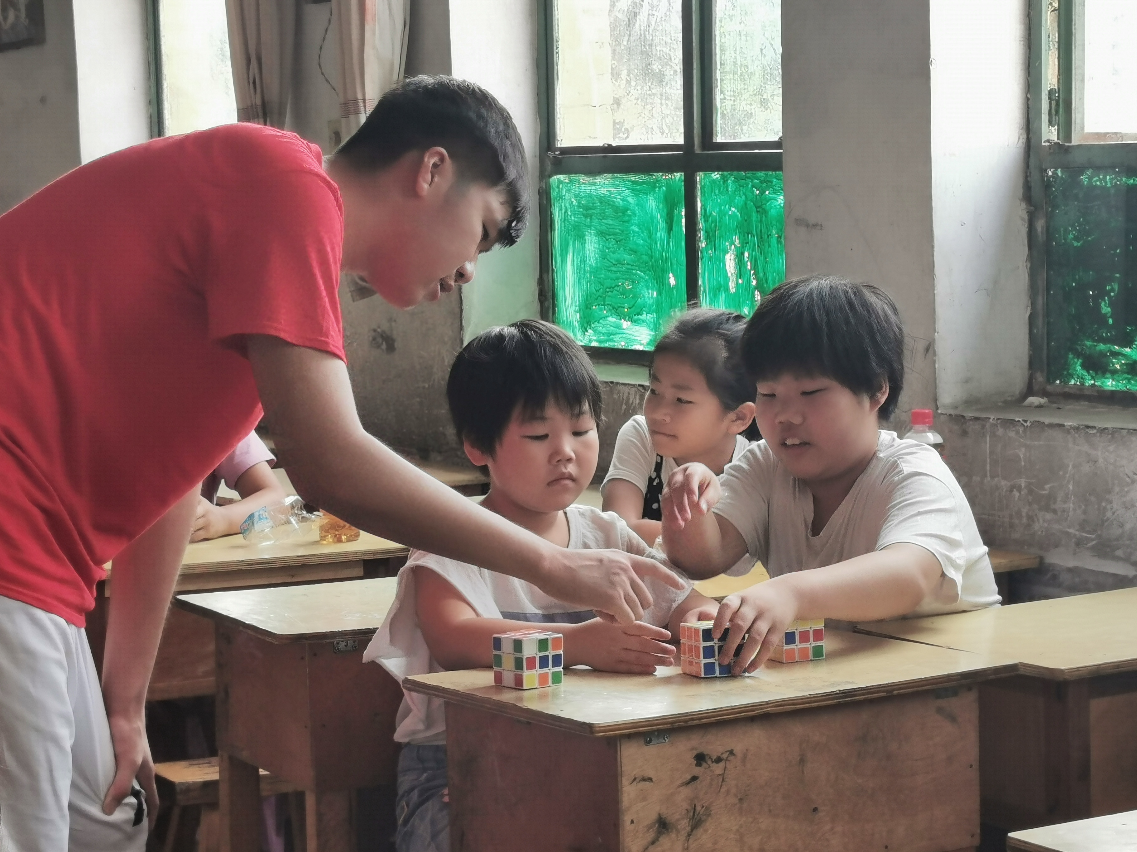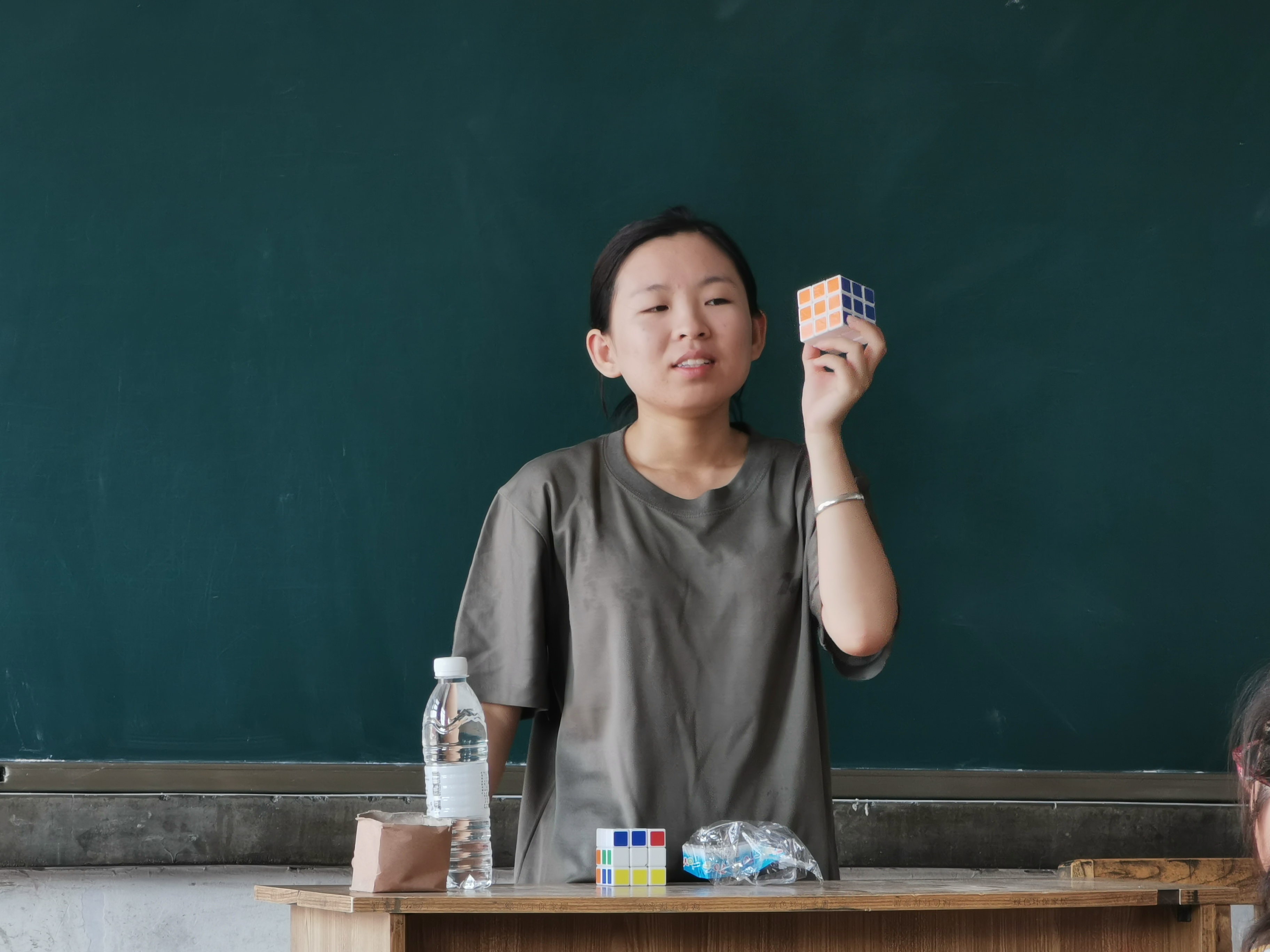 第一堂课是魔方课,由有着四年支教经验的闫娜带队指导老师授课。延续了雁翎支教队六年的传统,闫娜从基础教起,讲述点线面三个基础点,并从魔方的基础构造和基础花色抓起,循序渐进。在员工理解后,又继续教授一阶魔方的基础理论。吴街小学的孩子反复练习,在老师要求举手向大家演示的时候,一双双小手齐刷刷的举起来,争相向闫娜展示自己的学习成果。“看到孩子们学得认真,我们自然教的更加起劲,这里的员工一点不比城里的孩子笨,我欣慰的同时也很惋惜,因为他们没有更好的学习平台去提升自己。”闫娜如是说。