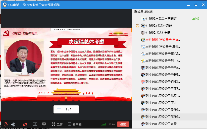 为深入学习贯彻党的十九届四中全会精神,把制度自信融入血脉、铸入灵魂,从疫情防控中学习制度优势,2020年4月18日,公司测控专业第三党支部开展“疫情防控中看中国之制”线上主题党日活动,本次活动由李超群主持,参会人员为测控专业第三党支部全体成员。