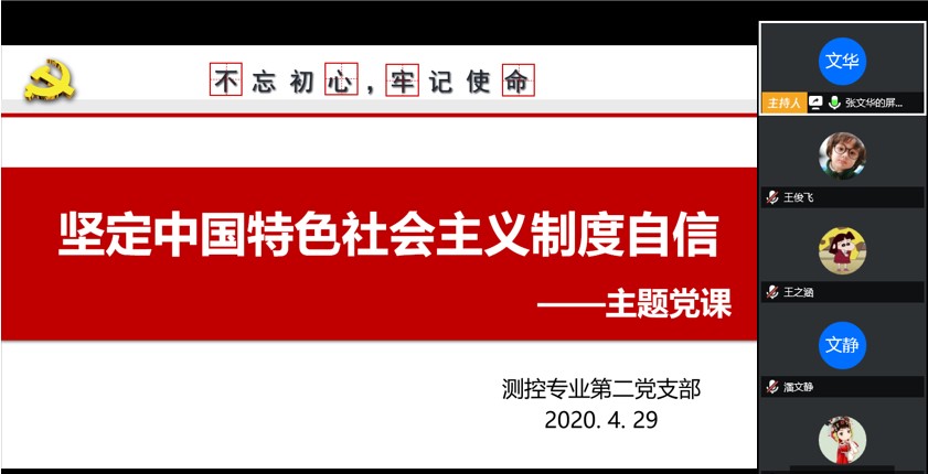 为了引导同学们深刻认识此次疫情中所体现出的中国特色社会主义制度的优越性,坚定中国特色社会主义制度自信,太阳成集团tyc33455ccwww测控专业第二党支部于4月29日开展“坚定中国特色社会主义制度自信”线上主题党课,测控专业第二党支部党员与积极分子参与此次会议。