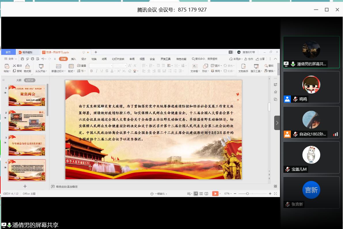 为了更好的学习贯彻“两会”精神,进一步增进支部全体成员对中国共产党和中国特色社会主义制度的政治认同、思想认同、理论认同、情感认同,我院自动化专业第二党支部于2020年5月28日晚上8点在腾讯会议上开展“聚焦两会”系列党课活动。活动由党支部书记高一鸣同志主持,党员潘倩男同志担任主讲人,全体正式党员、预备党员和入党积极分子参与此次活动。