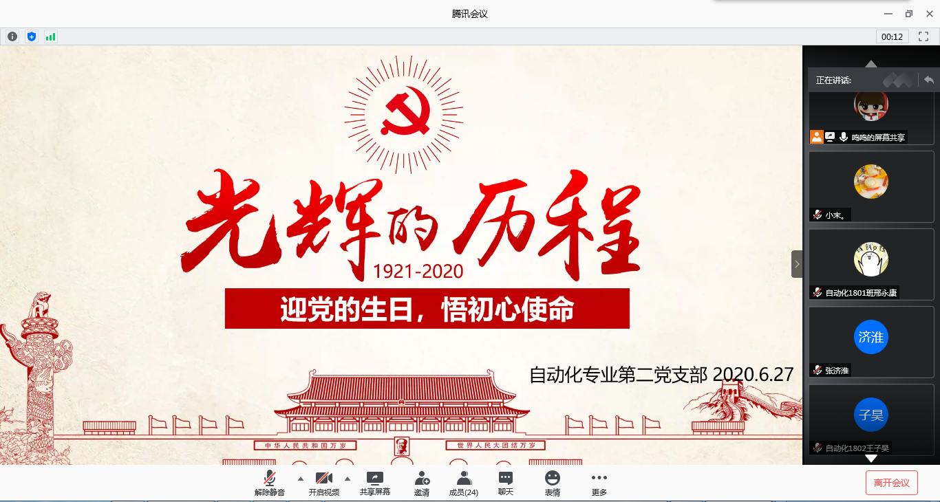 在即将迎来中国共产党99周年华诞之际,为深入贯彻落实中央、学校和公司党委关于新型冠状病毒肺炎疫情防控工作的部署要求,进一步巩固拓展“不忘初心、牢记使命”主题教育成果,我院自动化专业第二党支部于2020年6月27日晚上8点在腾讯会议上开展“迎党的生日,悟初心使命”主题党日活动。活动由党支部书记高一鸣同志主持,全体正式党员、预备党员和入党积极分子参与此次活动。