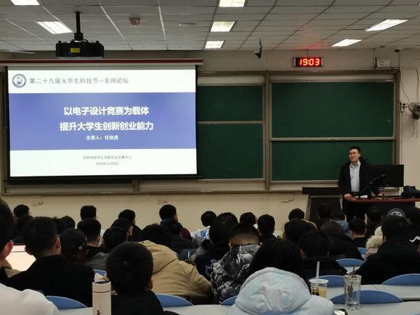 为营造良好的创新创业文化氛围,激发在校老员工的科技创新热情,提高老员工的科技创新能力。12月7日晚,公司在东环301举办的“以电子设计竞赛为载体,提升老员工创新创业能力”为主题的名师讲坛活动。海空学院副教授、公司电子设计竞赛负责人任旭虎老师做客讲坛,活动由学院员工创新创业发展中心指导老师蒋仁福主持。