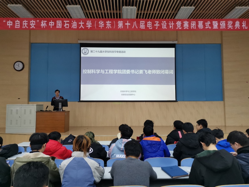 闭幕式上,首先由董恩廷宣读获奖名单,并由嘉宾为获奖员工逐一颁奖。随后由姜飞老师致闭幕词,他从活动赞助企业“中自庆安”创办者—公司毕业生林子晗的创业故事出发,鼓励员工积极参加以电子设计竞赛为代表的的各类创新创业比赛。他说:“参与比赛最重要的收获是一群志同道合的朋友,一份学以致用的能力和一种永不服输的创新创业精神。希望大家以本次比赛为最新起点,以更饱满的状态投入到创新创业比赛中。”随后,蒋仁福老师代表本次电子设计竞赛工作团队做比赛总结。他从本次比赛组织情况,员工参与情况,获奖分布情况,赛后高级培训安排等做了详细说明。他说:“本次比赛,组织规模大,参与员工多,是一次参与面广、影响力大的重要校级赛事。本次比赛,是全新起点,希望大家向2021年电赛国赛发起冲击。”