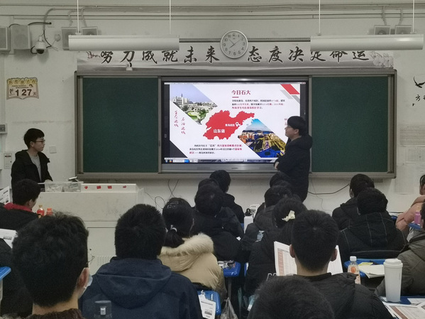 本次实践活动分为三个部分。活动伊始,实践队员向大家做自我介绍并向员工播放招生宣传视频,让他们对石大生活有简单的认识和了解。宣传片展示了石大的美丽风景,浓厚学风,凸显了惟真惟实,追求卓越的石大精神。宣讲活动第二部分是由来自石油工程学院的刘珏员工和计算机科学与技术学院的吴昊员工通过幻灯片展示更多的石大风貌和特色。队员们从初识石大,求学石大,校园生活,成就未来四个部分进行入手,着重介绍了学校特有的本研一体班,理科试验班以及依托学校平台优势给予员工学业上的支持,同时也结合自身求学经历分享了石大丰富的校园生活和文化。最后,实践队员们跟据大家提出的问题一一解答,并就高考备考做出了经验分享。