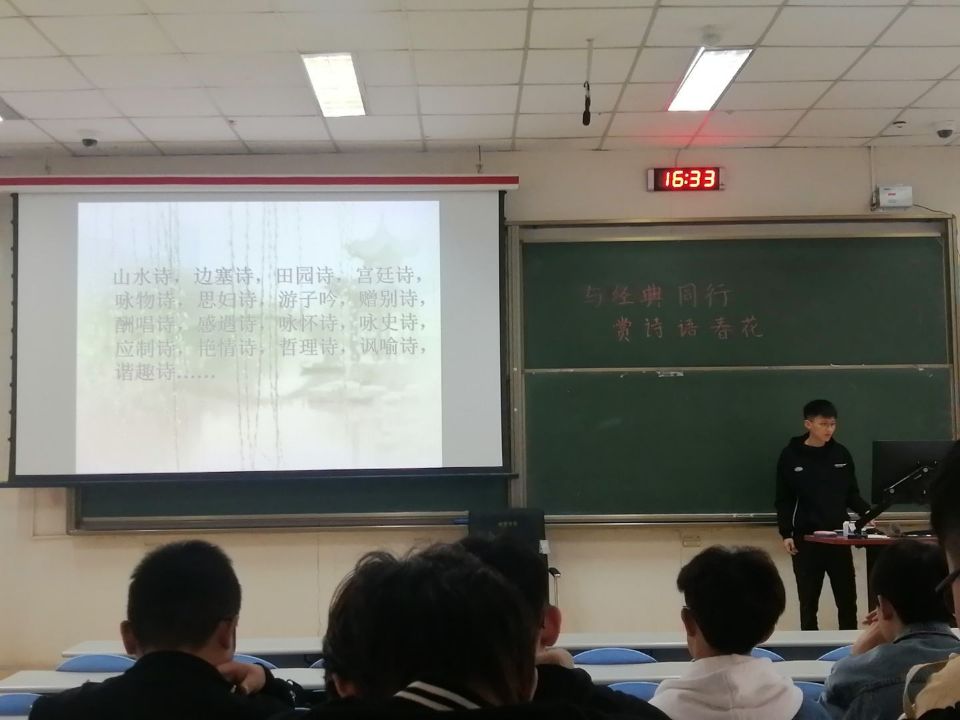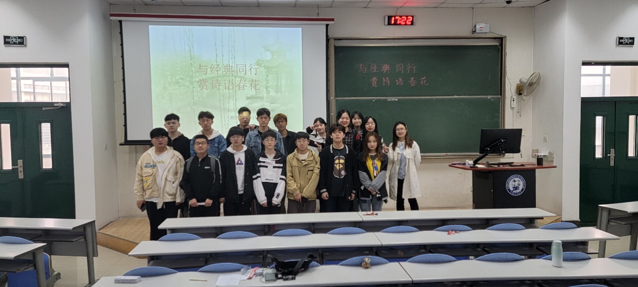 为了弘扬中国优秀传统文化,增强同学们对传统诗文化的了解与热爱,测控1901班团支部于4月25日在东环206举行“与经典同行,赏诗语春花”主题团日活动。此次活动由宣传委员李彬主持,支部全体成员参加。