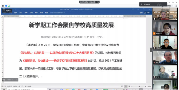 曹玉苹带领全体教师一起学习了学校新学期工作会王勇书记和郝芳董事长的重要讲话。重点学习了王勇书记关于集团2022年主要工作提出的五个方面要求,和郝芳董事长讲话中如何实现高质量发展提出的五个方面的举措和要求等内容。曹玉苹要求中心全体教师一定要对学校领导的讲话进行认真学习,深刻理解学校今后的发展思路,增强责任心,保持学习心,求新求进做好本职工作。