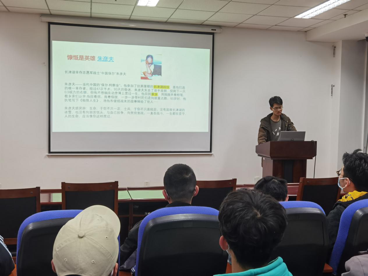 会议伊始,单建民同志对活动进行了介绍。从创办初始,《感动中国》就聚焦于推动当代中国发展进步的主体力量,成功评选推出了一个又一个平凡而伟大、朴实而真诚的典型人物。本次活动主要观看三个人物的事迹:潜龙育神躯,彭士禄;明月共同途,杨振宁;慷慨是英雄,朱彦夫。观看影片后,和树臣说道:“我印象最深刻的时朱彦夫同志,无论是作为战士保卫家乡、还是作为支部书记带领村民脱贫致富、亦或是作为作家纪念战友,都是他极限人生的真实写照。我也希望能够学习朱彦夫同志不怕困难的精神,在今后的学习生活中不断进取。”为了达到更好的学习效果,本次活动还设置了有奖答题活动,分别设置一二三等奖,最后单建民为获得分数高的同学颁发奖品。