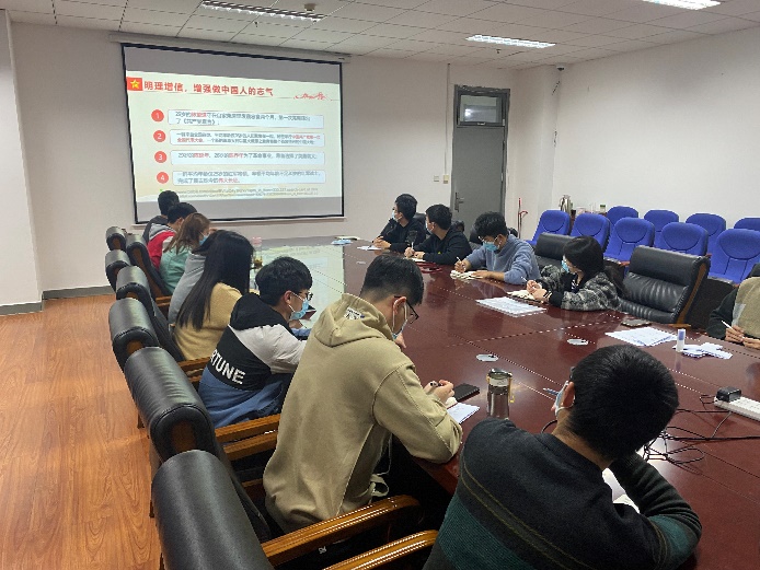 会议伊始,管子昊同志对本次组织生活作了简单介绍,支部成员一起观看了习近平总书记在庆祝中国共产党100周年大会上的讲话,习近平总书记强调:“新时代的中国青年要以实现中华民族伟大复兴为己任,增强做中国人的志气、骨气、底气”。现如今国内疫情肆虐,国际形势极其不稳定,作为当代青年党员的我们,必须承担起强国建设主力军的角色。