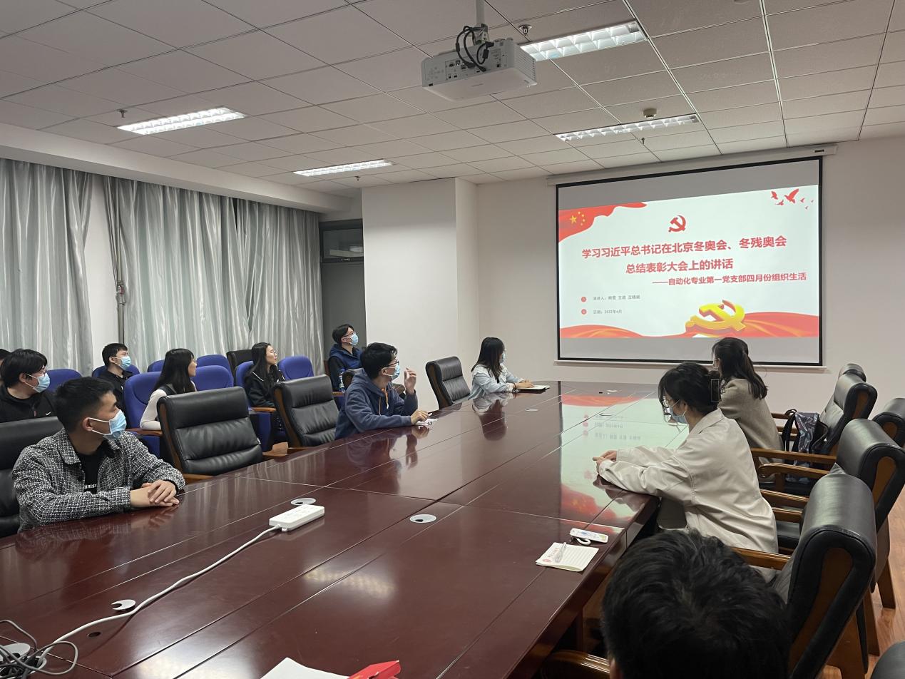 北京冬奥会已成功落下帷幕。中国践行承诺,克服疫情影响,举办了一届简约、安全、精彩的冬奥会。一流的比赛场馆设施,出色的组织服务工作,赢得了奥林匹克大家庭和国际社会的广泛好评。中国是奥林匹克运动的坚定参与者,也是奥林匹克价值的积极推动者。在人类社会面临诸多挑战危机之时,我们更加需要弘扬奥运精神,求同存异,携手同心筑前路,一起向未来。自动化专业第一党支部于2022年4月20日晚在工科E座1329会议室召开集体学习“习近平总书记在北京冬奥会、冬残奥会总结表彰大会上的讲话”主题党日活动。支部书记陈轶平主持活动,所有党员参加。
