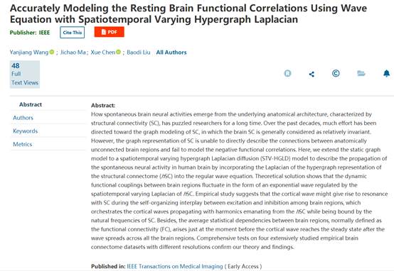 近日,公司王延江教授团队在人脑功能网络连接建模研究领域取得新进展,相关研究论文《Accurately Modeling the Resting Brain Functional Correlations Using Wave Equation with Spatiotemporal Varying Hypergraph Laplacian》 (基于时空变化超图Laplacian和波动方程的静息态人脑功能连接建模)在医学成像领域国际顶级期刊IEEE Transactions on Medical Imaging (简写IEEE TMI)上发表(在线)。王延江教授为第一作者和通讯作者,公司2019级博士研究生马吉超为第二作者,太阳成集团为第一署名单位。