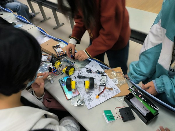 理论知识讲解完毕后,进入实践环节。林晓欣同学亲手带领中心成员进行小车硬件组装。主讲人通过边组装边讲解的方式,让同学们清晰地认识到小车组装的具体步骤与方法。中心成员二人或三人组队都积极热情地跟着动手组装。