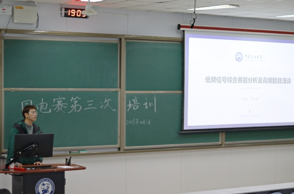 本次培训的主题是“低频信号综合赛题分析及高频题目浅谈”,为参与国电赛选拔的同学分析历年电赛中的低频题和高频题,分享比赛感受。培训伊始,李正喆通过举例分享了他对电赛信号题的理解与经验。随后,李正喆承上启下、由浅入深地从历年赛题分析、测量仪表电路基本结构、常用测量电路、高频电路四个部分依次进行讲解。