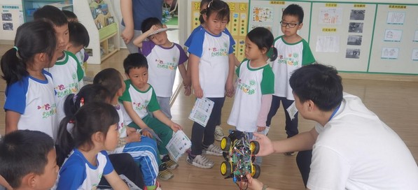 图一 志愿者向小朋友们介绍小车结构