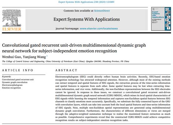 近日,公司王延江教授团队在脑电情绪识别研究领域取得新进展,相关研究论文《Convolutional gated recurrent unit-driven multidimensional dynamic graph neural network for subject-independent emotion recognition》 (卷积门控递归单元驱动的多维动态图神经网络用于被试独立的情绪识别)在线发表于国际权威期刊Expert Systems With Applications。公司2020级博士研究生郭文慧为第一作者,王延江教授为通讯作者,太阳成集团为唯一署名单位。