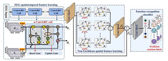 由于脑电图(EEG)可以更客观和真实地反映一个人的情绪状态并能记录大脑神经活动,因此如何通过EEG信号来对人脑不同情绪状态进行准确识别,在疲劳驾驶监测、抑郁疾病诊断等领域具有重要的应用价值。近年来,尽管现有的大多数方法能够提取EEG信号的时序和空间特征,但时间序列信息和空间特征的提取过程彼此是分离的。在提取时间序列信息时,一些空间特征可能会丢失,反之亦然。此外,由于电极在头皮上的位置决定了它们记录到的脑电信号,不同位置的电极会受到不同脑区活动的影响,因此电极之间构成的空间布局对于理解和解释脑电信号至关重要。同时,通过考虑电极之间空间关系的非欧性,可以帮助我们理解不同脑区之间的相互作用和功能连接,从而揭示脑网络的结构和功能特性。因此,EEG电极之间的非欧几里得空间表示不能被忽略。针对上述问题,该团队构建了一个卷积门控递归单元驱动的多维动态图神经网络(CGRU-MDGN),如图1所示,该网络在学习时间信息的同时能够挖掘其EEG信号的局部空间特征,并能捕获EEG电极之间的非欧几里得空间特征,有助于更准确地对情绪状态进行识别。特别是,这一模型在面对被试独立的实验设计下也能很好地捕获不同情绪状态的特征表达,且在三个基准数据集的实验中达到了目前最好( SOTA)性能。除此之外,这一模型有利于对患有面瘫、面部烧伤或肌萎缩侧索硬化症(ALS)和抑郁症等疾病患者的情绪状态的学习和提取,并可为相应患者实现脑机交互提供技术支撑。
