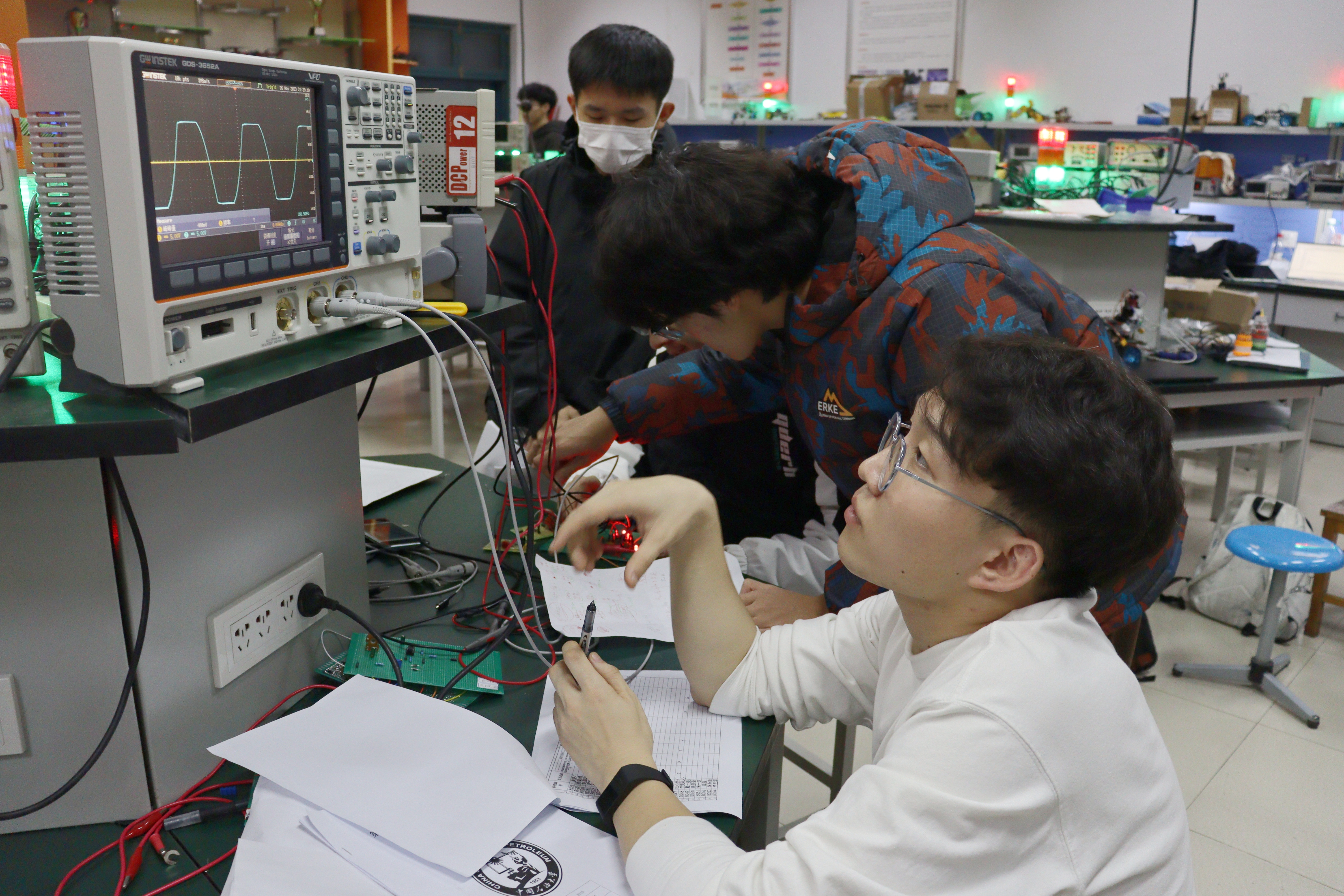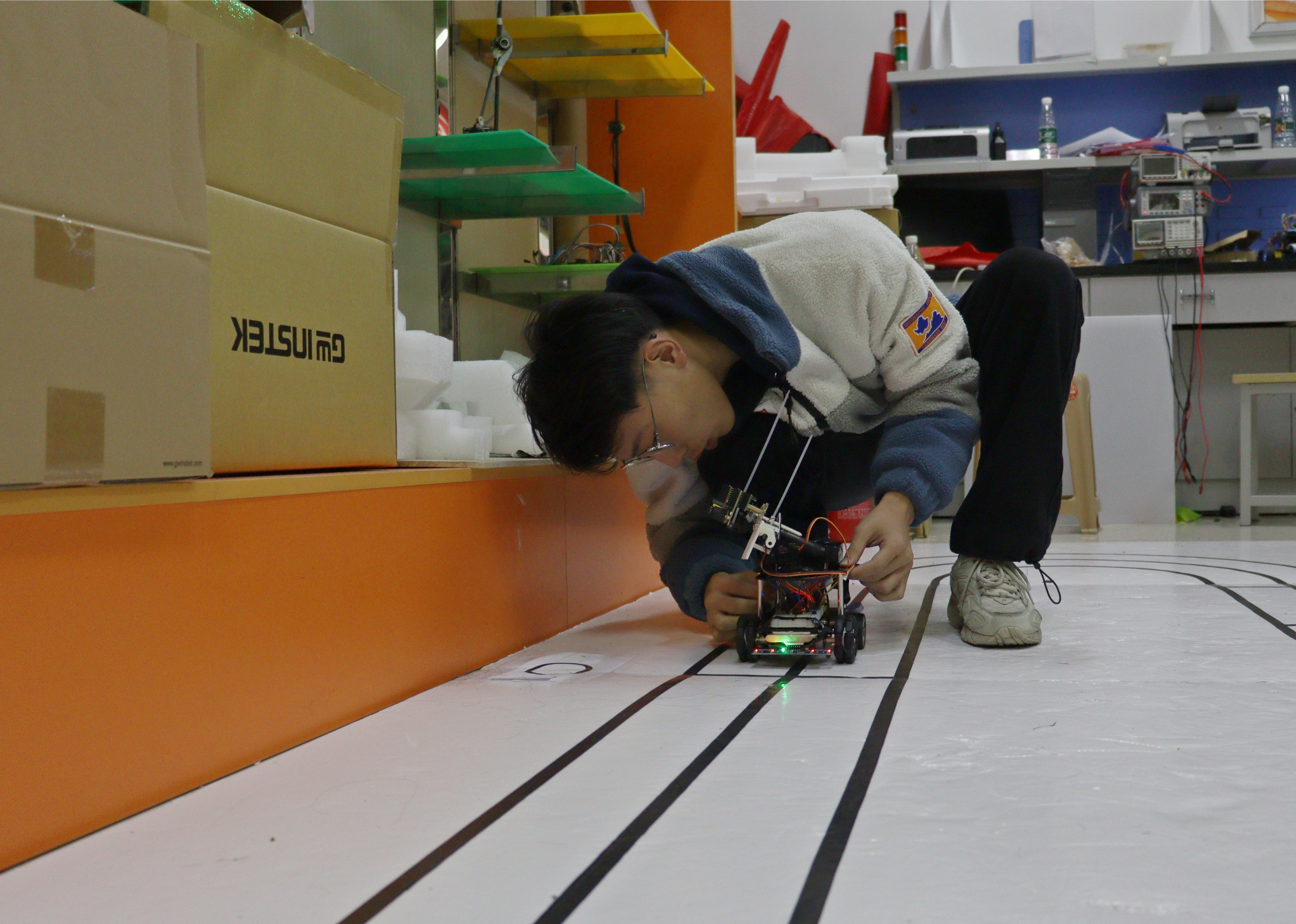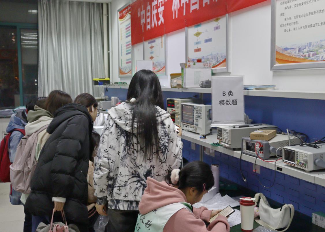 经过为期一周的紧张备赛阶段,各组于11月26日19时迎来了最终的验收。外边天气寒冷,实验室内却热火朝天、气氛热烈。参赛队伍按照不同组别有条不紊地进行验收,各位评委现场根据作品基本要求的实现、扩展要求的实现和设计报告三个方面进行现场打分,并对他们进行指导。