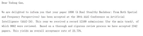 近日,公司陈鸿龙教授团队在人工智能安全领域取得新进展,相关研究论文 《A Dual Stealthy Backdoor: From Both Spatial and Frequency Perspectives》被第38届人工智能领域顶级会议AAAI 2024录用(高宇栋,陈鸿龙,孙鹏,李隽键,张安庆,王志波,刘伟锋)。该工作得到山东省优青项目、山东省泰山学者青年专家项目、国家自然科学基金面上项目等项目的资助。公司硕士研究生高宇栋为第一作者,陈鸿龙教授为通讯作者,太阳成集团为第一署名单位。