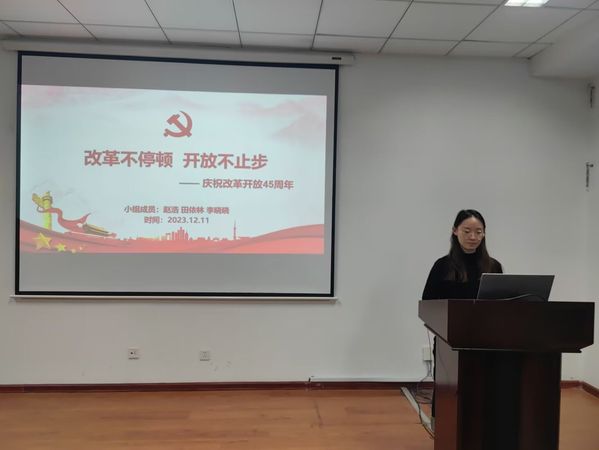 会议伊始,支部成员们一同观看了改革开放四十五周年纪念视频。此视频围绕1979年到2023年我国所取得的重大成就展开,期间一个个优秀的学者、一个个领域的开拓者和建设者为祖国建设添砖加瓦。接着,赵浩同志指出了改革开放带给我们的启示:改革开放是高质量发展的动力之源,其关键是不断解放和发展社会生产力。然后,她对中国将坚定推进高水平开放作出阐释。以开放促改革、促发展是我国现代化建设不断取得新成就的重要法宝。中国将坚定加快打造对外开放新高地,建设更高水平开放型经济新体制,加快构建新发展格局。最后,她通过知识竞答的形式对此次会议进行了回顾,与会党员积极参与。