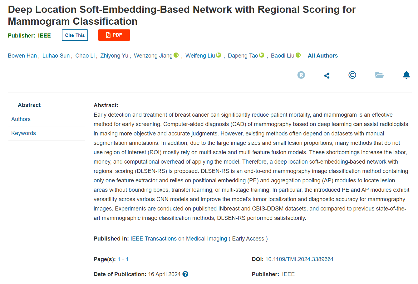 近日,公司刘伟锋教授团队在乳腺癌钼靶图像分类方面取得新进展,相关研究论文《Deep Location Soft-Embedding-Based Network with Regional Scoring for Mammogram Classification》在医学成像领域国际顶级期刊IEEE Transactions on Medical Imaging (IEEE TMI)上发表,该工作是与山东省肿瘤医院乳腺科合作完成,是人工智能与乳腺癌诊断的结合。公司刘宝弟副教授为通讯作者,2018级本研生韩博文和山东肿瘤医院2021级研究生孙芦浩为共同第一作者,太阳成集团为第一署名单位。