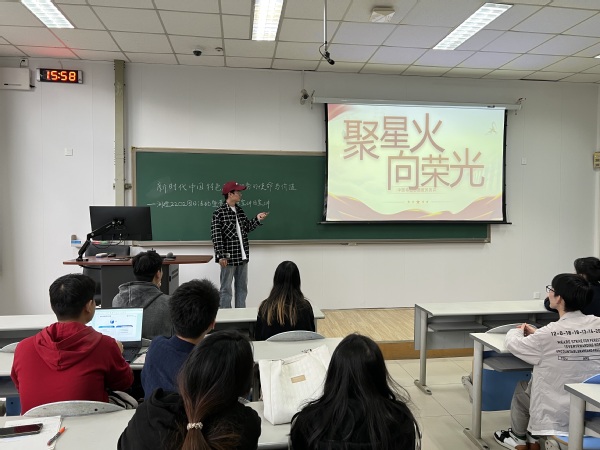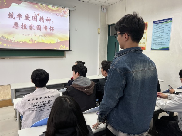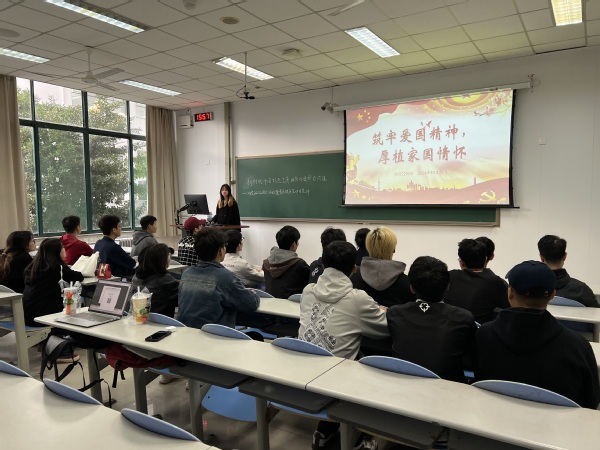 为加强青少年的爱国主义精神以及深厚的家国情怀,庆祝祖国七十五周年华诞,测控2202团支部联合控院员工会于2024年10月20日下午,在南堂104举办以“筑牢爱国精神,厚植家国情怀”为主题的团日活动,青马燎原宣讲团的成员翟佳羽担任本次团日活动的嘉宾,测控2202的团支书甘雨禾担任本次团日活动的主持人。
