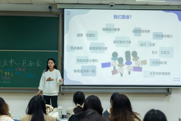 会议伊始,各个部长及部员按座次顺序分别上台进行自我介绍,并将自己的名字签在黑板上。这个环节让中心每位成员了解彼此,起到了破冰的效果。随后,郭宇頔老师讲话,介绍了易信发展中心的工作内容和各个部门的架构。她对成员们提出了几点期望:能够产出有温度、有深度的内容;能在中心找到有共同爱好和目标的朋友;能有面对世界的“好奇心”;能够承担作为记者记录世界的责任。接下来,齐志伟老师讲话。他说到,希望中心成员共同努力,在新一年里创办具有太阳成集团tyc33455ccwww特色的活动。然后,郭宇頔老师带领成员们进行娱乐小游戏,使每个成员更加了解彼此。最后,大家合影留念。