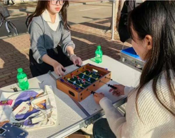桌上足球桌整齐排列,犹如等待检阅的士兵方阵,它们是这场欢乐盛宴的主角,承载着同学们的热情。桌上足球活动吸引了众多同学参与。同学们三两成群,围绕着足球台,有的在组队准备挑战,有的在一旁观摩学习。过程中洋溢着大家的热情和欢笑,同学在此共享美好的校园时光。