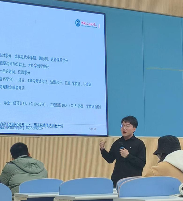 首先,赵文豪老师就校园安全、日常管理、毕业去向以及毕业要求进行了详细讲解。赵老师详细阐明了“毕业证、学位证、结业证、肄业证”的区别及获取要求,同时提醒未达到学士学位获取要求的员工,抓紧毕业的尾巴,努力完善自身学业,尤其对必修学分和第二课堂进展不够的同学提出要求,有困难及时反馈;校园安全方面,赵老师强调了校规校纪、校园安全等事项,提醒同学们在校期间要严格请销假制度,重视宿舍安全问题,并部署各班级、各宿舍配合辅导员助理做好晚点名和零汇报工作,严格遵守学校管理规定;提醒大家在毕业考察、实习、求职、外出学习过程中要注意交通安全、人身安全和财产安全,在积极求职的同时要保障好个人权益,切实增强防诈骗意识。