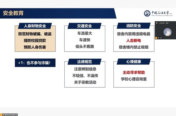 曾菲对交通安全、人身财产安全等基本安全问题,结合案例进行说明,希望同学们在开学初增强安全意识。曾菲带领同学们一起观看了关于宿舍安全警示视频,对宿舍安全进行重点强调。她指出,宿舍生活是校园生活的重要部分,希望同学们遵守相关规定,定期自查,不要为宿舍安全埋下隐患。最后,曾菲老师通过真实案例对考试违纪、电器安全、实验室安全等问题进行警示,提醒同学们引以为戒,不要触碰“红线”。