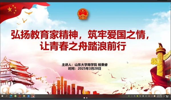 山东大学商学院杨秉睿同学,以“弘扬教育家精神,筑牢爱国之情,让青春之舟踏浪前行”为主题,生动讲述山大老董事长潘承洞的生平事迹,带领大家学习潘承洞先生的教育家精神。他指出,潘承洞先生为数学、教育事业奉献自己的一生,这激励着广大青年树立理想主义追求,培养吃苦耐劳和守正创新精神,在这个科技创新的黄金时代,将个人理想融入国家发展大局,用青春的创造活力点燃科技强国梦想,在实现中国式现代化的壮阔征程中书写属于当代青年的璀璨篇章。
