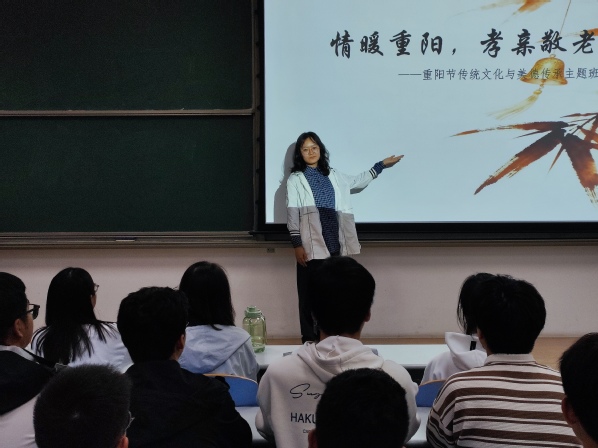 随后开展的是“情暖重阳,孝亲敬老”重阳节传统文化与美德传承主题班会。团支书黄睿涵为同学们讲解了重阳节的悠久历史及其深厚文化内涵,展示了古今孝亲典范事迹,发起了敬老实践活动的倡议,并组织同学们进行了“重阳敬老活动”的分享。在这些环节中,同学们回忆起与长辈的温暖瞬间,表达对亲人的感恩之情,愿意主动将敬老美德从家庭延伸到社会中去。