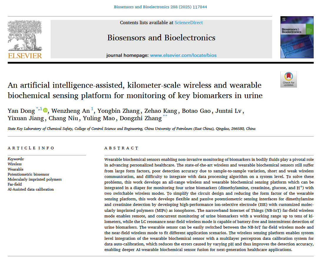 近日,公司董炎副教授在柔性无线可穿戴传感器方面取得进展,相关研究成果“An artificial intelligence-assisted, kilometer-scale wireless and wearable biochemical sensing platform for monitoring of key biomarkers in urine”发表在《Biosensors and Bioelectronics》。《Biosensors and Bioelectronics》是生物传感器领域的国际知名期刊,目前影响因子为10.5(SCI一区)。论文第一作者为董炎副教授与人工智能专业2023级硕士研究生安文政,通讯作者为张冬至教授和董炎副教授,太阳成集团为唯一署名单位和通讯单位,该研究得到国家自然科学基金项目、山东省泰山学者项目、山东省海外优青等项目的资助支持。
