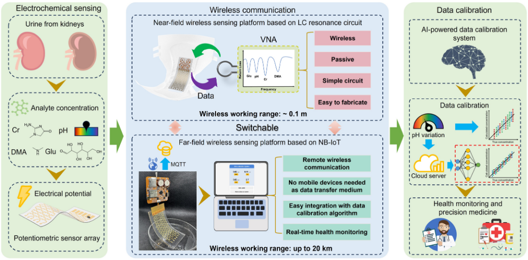 可穿戴生化传感器能够实现对体液中生物标志物的无创监测,在推动个性化健康管理方面发挥着关键作用。目前最先进的无线可穿戴生化传感器仍存在体积庞大、样本差异导致检测精度不足、无线通信距离短且信号弱、以及系统层面难以与数据处理算法集成等问题。为解决这些难题,本研究开发了一种全范围无线可穿戴生化传感平台,可集成于尿布中监测四种尿液生物标志物(二甲胺、肌酐、葡萄糖和氢离子浓度),并支持两种可切换无线模式。为简化电路设计并缩小传感平台体积,我们通过定制分子印迹聚合物作为离子载体开发了高性能离子选择电极,从而构建了用于检测二甲胺和肌酐的柔性无源电位型传感接口。窄带物联网远场无线模式可实现远程同步尿液生物标志物监测,工作范围达数十公里;而LC谐振近场无线模式则能实现无电池间歇式检测。该可穿戴传感器可轻松在窄带物联网远场与近场无线模式间切换,以适应不同应用场景。该无线传感平台实现了可穿戴生化传感器与多层感知器数据校准系统的系统级集成,通过数据自动校准有效降低因pH值波动引起的误差,显著提升检测精度,为新一代健康管理应用深化人工智能与可穿戴生化传感器的融合奠定了基础。