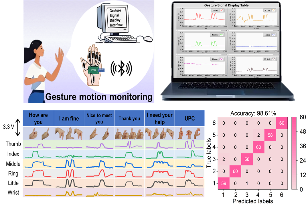 随着柔性电子和人机交互技术的不断发展,手语识别领域对柔性传感器的需求进一步扩大。水凝胶凭借其能将机械形变高效转化为电信号的能力,成为柔性传感器的理想候选材料。为解决传统水凝胶因水分蒸发或低温冻结导致使用寿命不足的局限性,本研究采用一步聚合法制备了一种复合水凝胶,该方法在含离子液体([EMIM]Cl)、聚多巴胺(PDA)和碳纳米管(CNTs)的体系中,使丙烯酰胺(AM)单体原位聚合形成聚丙烯酰胺(PAM)网络。得益于PDA、[EMIM]Cl与PAM之间多种相互作用机制,包括氢键、π-π堆积和共价键,所制备的水凝胶展现出优异的拉伸性能、出色的保水性、抗冻特性和强粘附性。作为应变传感器,其具有高灵敏度、快速响应和循环稳定性。通过将水凝胶应变传感器与外围电路及1D-CNN算法集成,可准确捕捉手部运动,实现对六个复杂手语手势的检测准确率达98.61%,这为高性能手语识别提供了有效解决方案。