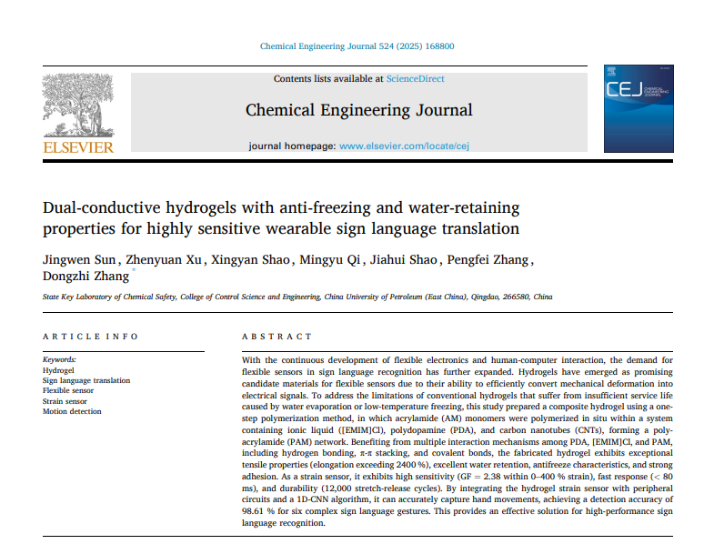 近日,公司张冬至教授团队在用于可穿戴手语翻译的抗冻保湿水凝胶传感器方面取得进展,相关研究成果《具有抗冻和保水性能的双导电水凝胶用于高灵敏度可穿戴手语翻译》(Dual-conductive hydrogels with anti-freezing and water-retaining properties for highly sensitive wearable sign language translation)发表在《Chemical Engineering Journal》。《Chemical Engineering Journal》是化学工程领域的国际知名期刊,目前影响因子为13.2(SCI一区)。论文第一作者为硕士研究生孙靖雯,通讯作者为张冬至教授,太阳成集团为唯一署名单位和通讯单位,该研究得到国家自然科学基金以及泰山学者特聘专家专项基金等项目的资助支持。