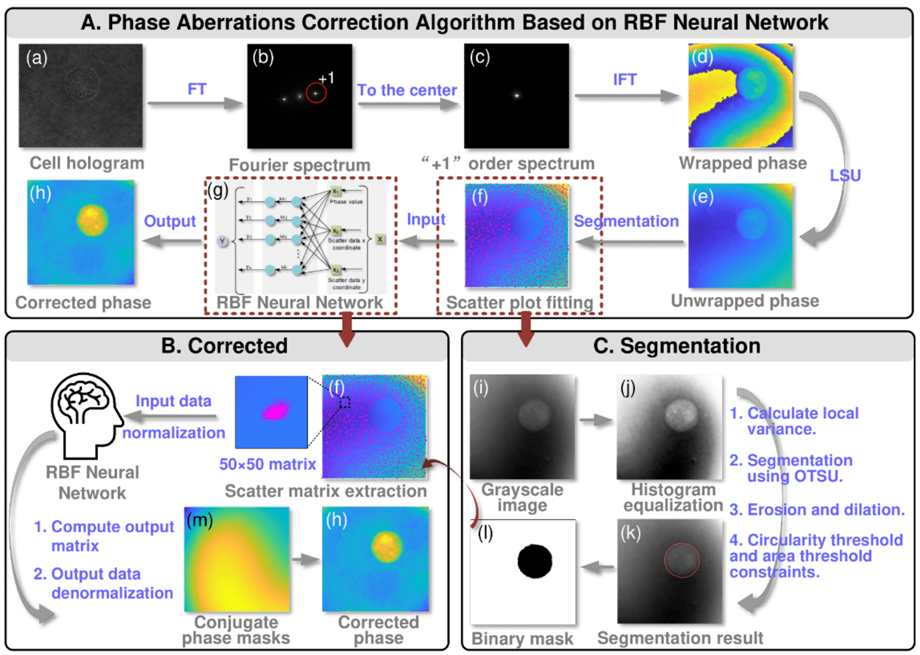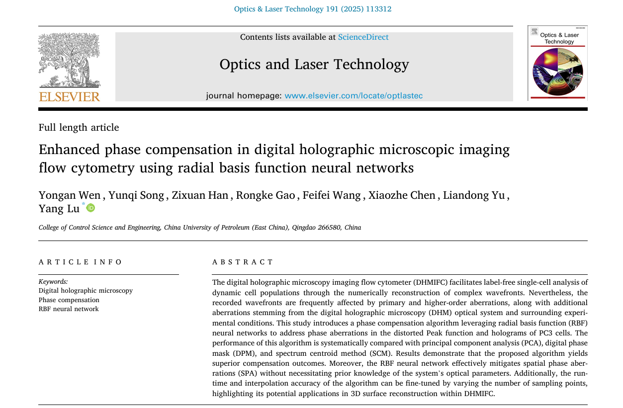 近日,公司动力工程专业2022级博士研究生文永安在数字全息相位畸变补偿算法方面取得进展,相关研究成果《Enhanced phase compensation in digital holographic microscopic imaging flow cytometry using radial basis function neural networks》发表在《Optics and Laser Technology》。《Optics and Laser Technology》是物理光学领域的国际知名期刊,影响因子5.1(SCI二区Top)。论文第一作者为文永安,通讯作者为陆洋副教授,太阳成集团为第一署名单位和通讯单位。