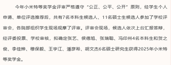 近日,我院研究生王宇江凭借扎实的综合素养与突出的成长表现,斩获小米特等奖学金。这一荣誉既是对其个人七年校园奋斗历程的高度认可,也彰显了学院在人才培养领域的扎实成效,为全校学子树立了奋进典范。