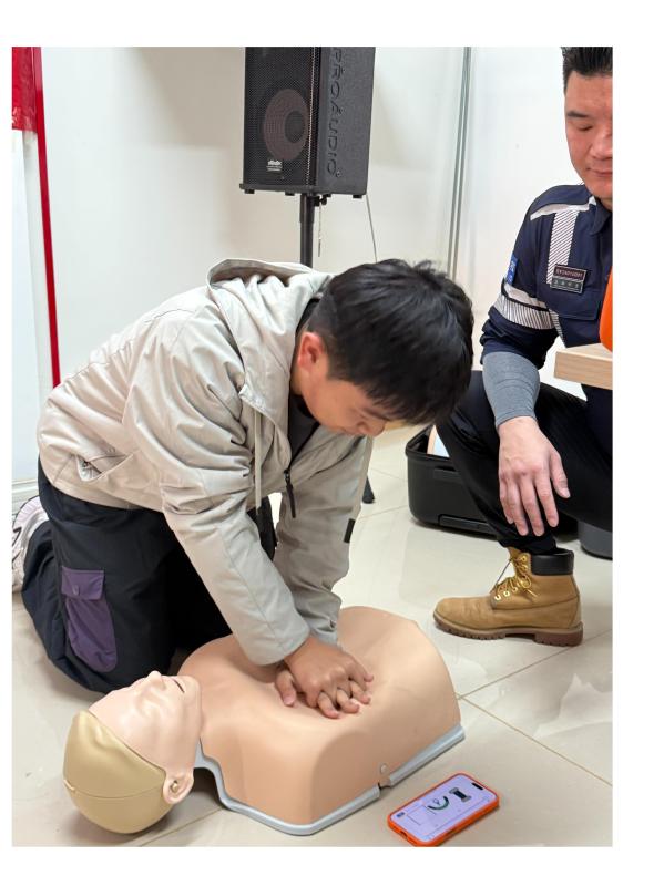 演示结束后,员工自主进行实践演习。在张老师一对一指导下,大家轮流操作模拟,练习按压、呼吸的配合节奏,尝试AED设备的模拟使用。部分员工在开始尝试练习时动作不够规范,经张老师调整按压角度、力度后,逐渐掌握了操作要领。