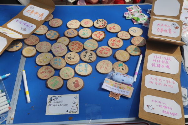 在年轮树干切片寄语环节,一个个承载着岁月痕迹的树干切片整齐摆放,成为传递美好的独特载体。同学们驻足停留,拿起笔墨,将对春日的期盼、对生活的热爱、对他人的祝福书写在纹理清晰的切片上,让自然的年轮与真挚的祝福相融,定格下思美节的温暖瞬间。另一旁的长幅文牒环节同样备受青睐。大家静下心来,将对未来的期许、对自我的鼓励、对成长的感悟,郑重书写在文牒之上,或是倾诉心声,或是立下誓言,在笔墨流转间,完成了一次自我审视与心灵滋养。两个环节各具特色,既让同学们在参与中感受美、创造美,更在表达中收获成长、传递善意,完美诠释了“美益”主题的深刻内涵。