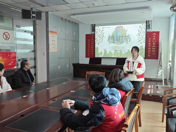 另一组志愿者紧扣植树节契机,开展绿色环保宣讲。他们从植树节的由来讲起,介绍其与孙中山先生的渊源,阐述树木的生态价值,并结合治沙造林先进事迹,分享阳台种花、节约用纸等日常护绿方法及植树实操技巧,引导居民树立“爱绿、护绿、植绿”理念。